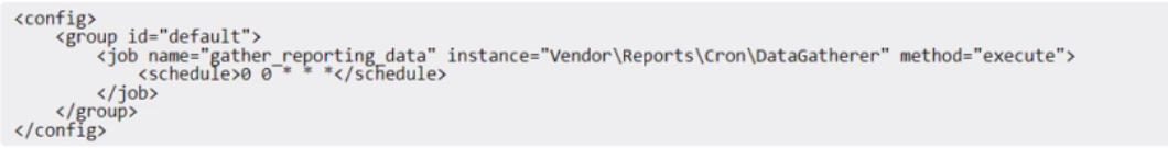 A custom cron job has been added to an Adobe Commerce system to collect data for several reports. Its crontab. xml configuration is as follows: