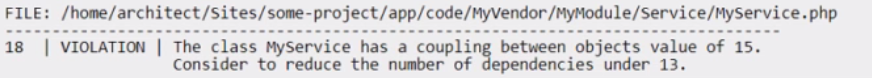 An Adobe Commerce Architect runs the PHP Mess Detector from the command-line interface using the coding standard provided with Adobe Commerce. The following output appears: