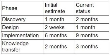 A partner is migrating a client from on premises to a hybrid cloud. Given the following project status information, the initial project timeline estimates need to be revised: