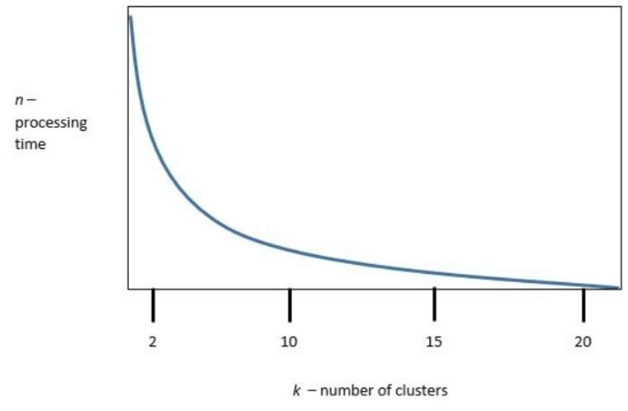 The curve shows a steep drop in processing time up to about k = 10, after which gains in speed taper off. Choosing 10 clusters balances sufficient model complexity with reasonable computational cost.