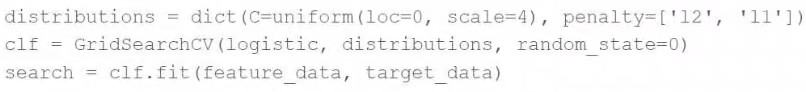 A data scientist is attempting to tune a logistic regression model logistic using scikit-learn. They want to specify a search space for two hyperparameters and let the tuning process randomly select values for each evaluation.