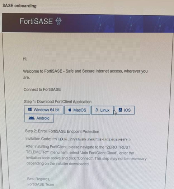 Communication Source (D): This email is generated by the FortiSASE administrator through the Onboard Users menu in the FortiSASE portal. It provides the user with direct download links for the FortiClient application and a unique Invitation Code required for telemetry connection.