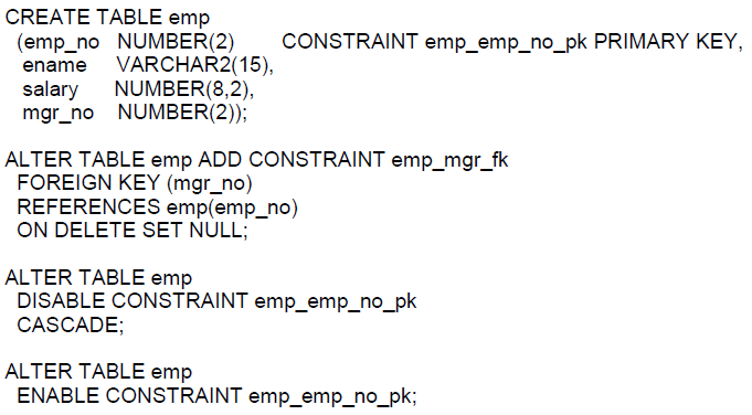 E . The foreign key constraint will be enabled and IMMEDIATE. This is correct as well. The foreign key constraint emp_mgr_fk was not explicitly disabled, so it remains enabled and in the immediate checking mode.