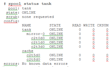 # zpool create tank mirror c2t0d0 c2t1d0 c2t3d0 cache c2t5d0 c2t8d0