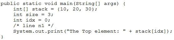 Which code fragment, inserted at line n1, prints The Top element: 30?