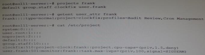 You and an associate named Frank administer a Solaris server. Frank will be responsible for monitoring system resource usage, so you set up a project entry for his account. Consider the following commands and output: