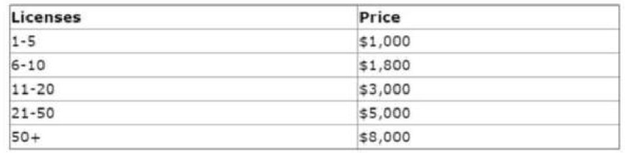 Universal Containers (UC) licenses shipping software that is sold for a fixed price based on each quantity tier as seen in the table below. For example, buying eight licenses would cost a total of $1,800 rather than multiplying unit price by quantity. Further discounts on this product are unavailable.